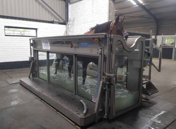 During the initial phase post-injury, load limiting is critical. In humans, this is achieved using devices such as knee and ankle braces, crutches, and moonboots, along with low-intensity exercises to encourage blood flow and cellular repair without over-stressing the tissue. However, until recently, there were no such devices for horses. Aqua therapy is most often utilised in the rehabilitation process for this purpose but it is challenging to determine the amount of loading on the limb using aqua therapy alone. While difficult, it is not impossible. The loading can be controlled by changing the height of the water. In horses, water at the level of the tuber coxae produces a 75% reduction in body weight, whereas water at elbow height has a 10% to 15% reduction in weight bearing. The increase in buoyancy reduces the effects of load bearing stress on joints and the surrounding soft tissue. Hydrotherapy obviously has other benefits like improved extension, increase cardiovascular fitness, built muscle tone, core strength and balancing of motion.Â